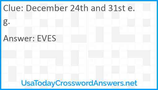 December 24th and 31st e.g. is a crossword clue for which we have 1 possible answer in our database. This crossword clue was last seen on USA Today Crossword July 5 2025!