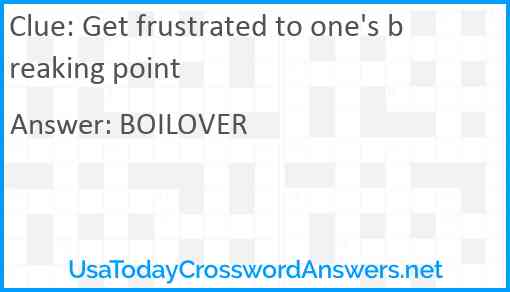 Get frustrated to one's breaking point is a crossword clue for which we have 1 possible answer in our database. This crossword clue was last seen on USA Today Crossword February 23 2025!