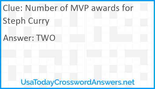 Number of MVP awards for Steph Curry is a crossword clue for which we have 1 possible answer in our database. This crossword clue was last seen on USA Today Crossword July 5 2025!