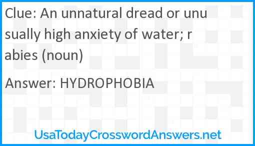 An unnatural dread or unusually high anxiety of water; rabies (noun) is a crossword clue for which we have 1 possible answer in our database. This crossword clue was last seen on USA Today Rootonym December 1 2025!