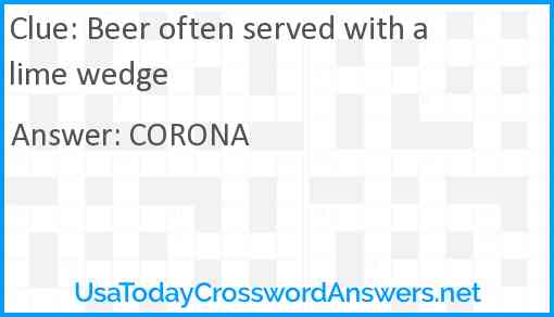 Beer often served with a lime wedge is a crossword clue for which we have 1 possible answer in our database. This crossword clue was last seen on USA Today Crossword November 16 2023!