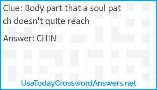 Body part that a soul patch doesn't quite reach is a crossword clue for which we have 1 possible answer in our database. This crossword clue was last seen on USA Today Crossword September 28 2023!