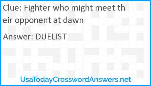 Fighter who might meet their opponent at dawn is a crossword clue for which we have 1 possible answer in our database. This crossword clue was last seen on USA Today Crossword January 27 2023!