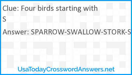 Four birds starting with S is a crossword clue for which we have 2 possible answer in our database. This crossword clue was last seen on USA Today Word Round Up January 29 2025!