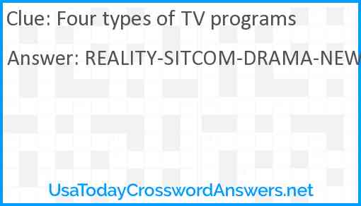 Four types of TV programs is a crossword clue for which we have 4 possible answer in our database. This crossword clue was last seen on USA Today Word Round Up March 13 2025!