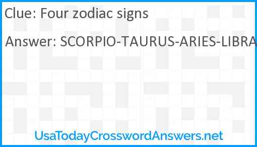 Four zodiac signs is a crossword clue for which we have 1 possible answer in our database. This crossword clue was last seen on USA Today Word Round Up September 21 2024!