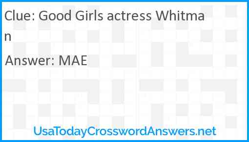 Good Girls actress Whitman is a crossword clue for which we have 1 possible answer in our database. This crossword clue was last seen on USA Today Crossword March 14 2024!