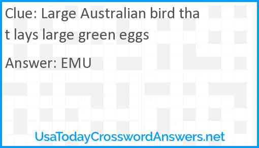 Large Australian bird that lays large green eggs is a crossword clue for which we have 1 possible answer in our database. This crossword clue was last seen on USA Today Crossword November 12 2022!