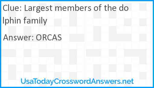 Largest members of the dolphin family is a crossword clue for which we have 1 possible answer in our database. This crossword clue was last seen on USA Today Crossword June 20 2025!