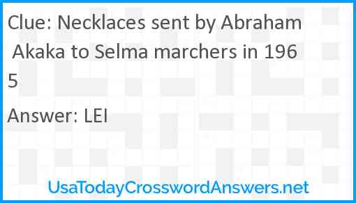 Necklaces sent by Abraham Akaka to Selma marchers in 1965 is a crossword clue for which we have 1 possible answer in our database. This crossword clue was last seen on USA Today Crossword January 31 2022!
