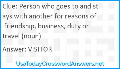 Person who goes to and stays with another for reasons of friendship, business, duty or travel (noun) is a crossword clue for which we have 1 possible answer in our database. This crossword clue was last seen on USA Today Rootonym February 27 2025!