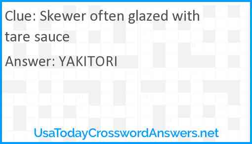 Skewer often glazed with tare sauce is a crossword clue for which we have 1 possible answer in our database. This crossword clue was last seen on USA Today Crossword November 13 2022!