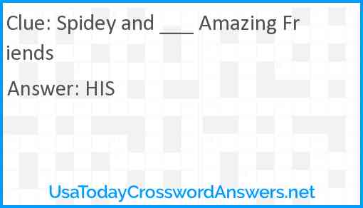 Spidey and ___ Amazing Friends is a crossword clue for which we have 1 possible answer in our database. This crossword clue was last seen on USA Today Crossword September 8 2022!