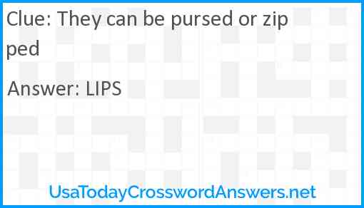 They can be pursed or zipped is a crossword clue for which we have 1 possible answer in our database. This crossword clue was last seen on USA Today Crossword January 15 2023!
