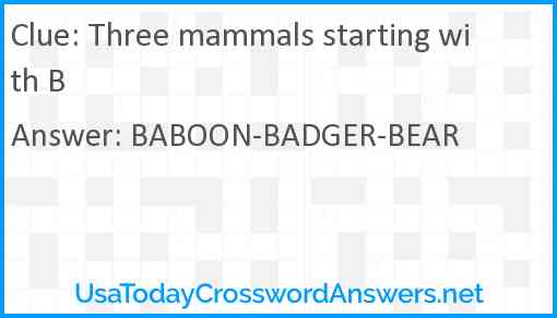 Three mammals starting with B is a crossword clue for which we have 2 possible answer in our database. This crossword clue was last seen on USA Today Word Round Up January 13 2025!